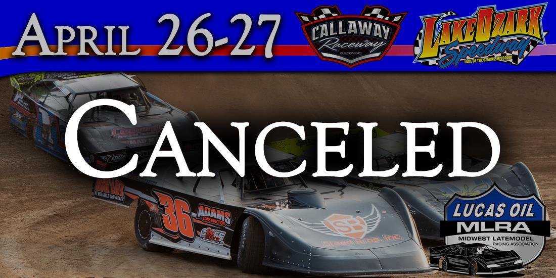 Eldon, MO. (4/24/24) Weekly area precipitation totals causing saturated running grounds and more rainfall predicted have caused Lucas Oil Midwest Late Model Racing Association management in coordination with Callaway Raceway and Lake Ozark Speedway officials to cancel the weekend scheduled for Friday, April 26th, and Saturday, April 27th. Series and track officials are working diligently to establish suitable rescheduled dates and will make announcements once finalized.